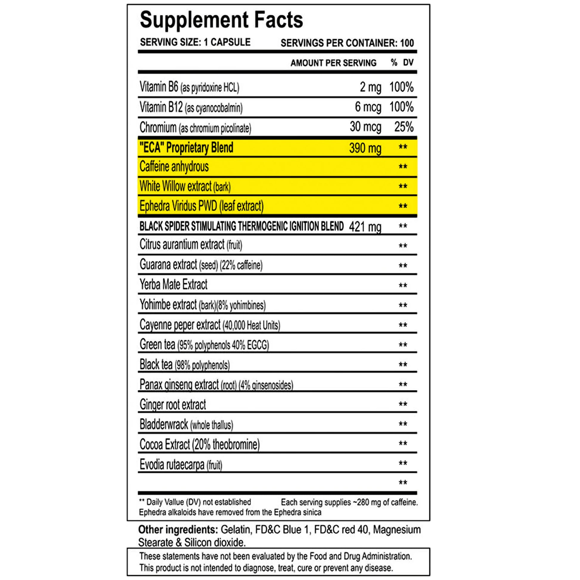 Black Spider Fat Burner is a dietary supplement containing a unique blend of natural ingredients designed to burn fat, increase energy and suppress appetite. Each package contains 100 capsules. The main active ingredient in Black Spider Fat Burner is ephedra, which is a powerful stimulant that helps increase metabolism and energy levels. Other key ingredients include caffeine, green tea extract, and yohimbine, which also help increase energy and burn fat. In addition to its fat burning ability, Black Spider Fat Burner also contains mood-enhancing ingredients such as phenylethylamine and theobromine, which can help improve overall mood and concentration.