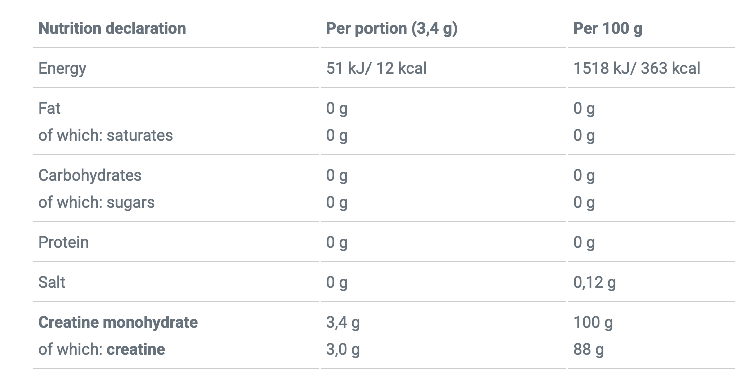 take 3,4 g of powder (1 and ½ scoop) per day during training. An increase of weight may happen. Not suitable for children and young persons. Do not exceed the recommended daily dose. Food supplements should not be used as a substitute for a varied and balanced diet. A varied and balanced diet and a healthy lifestyle are recommended.
