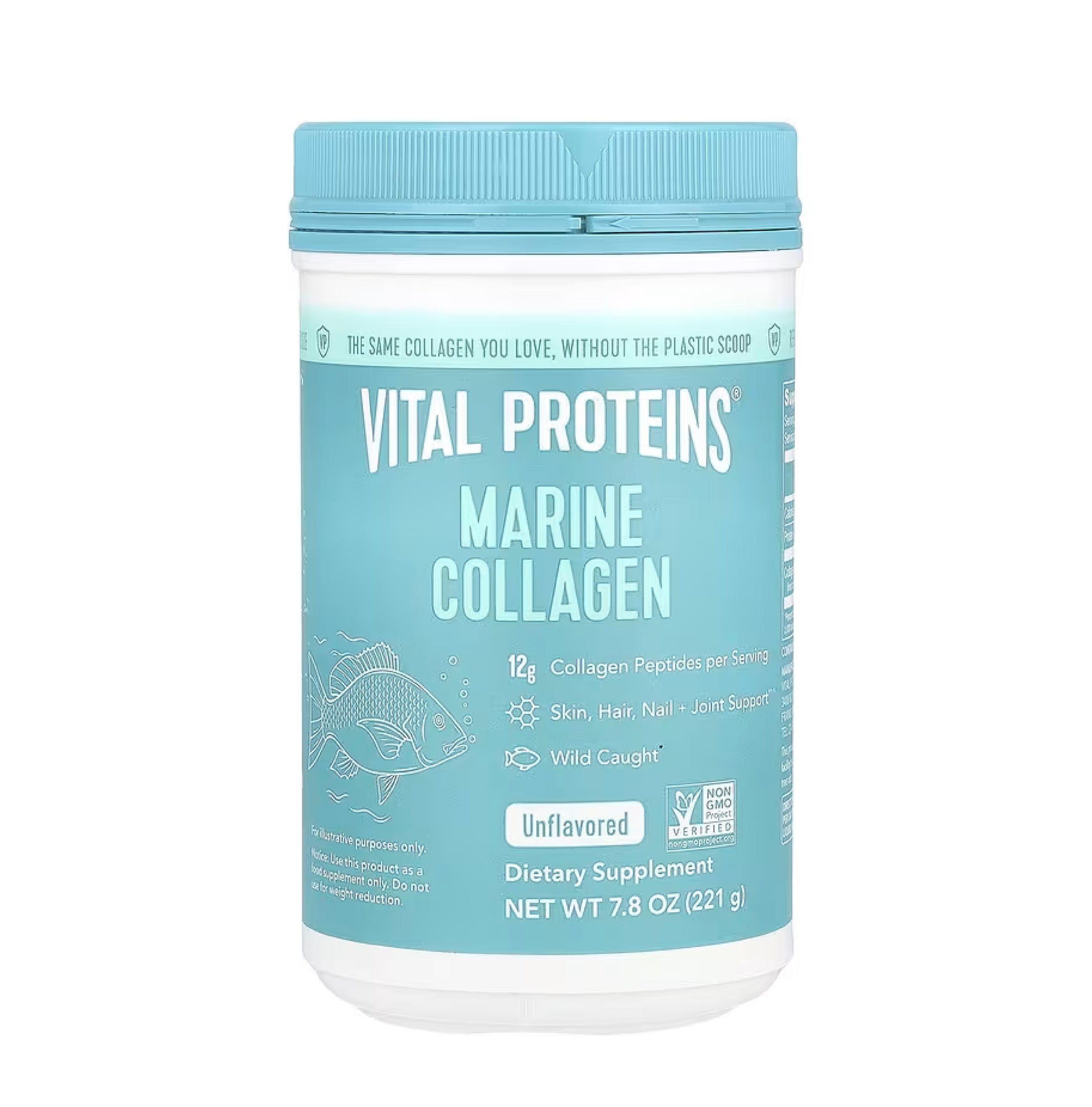 Vital Proteins® Marine Collagen contains 12g of collagen peptides per serving and is made from the scales of non-GMO Certified, wild-caught cod. It's highly bioavailable and digestible.